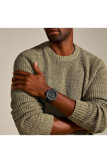 Case & Display 50mm round case in black stainless steel. Hardened mineral crystal protects analog dial face. Black dial with gray accent details.